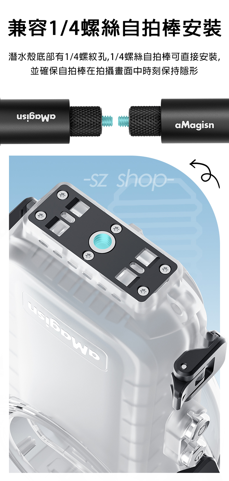 .兼容1/4螺孔方便安裝自拍棒