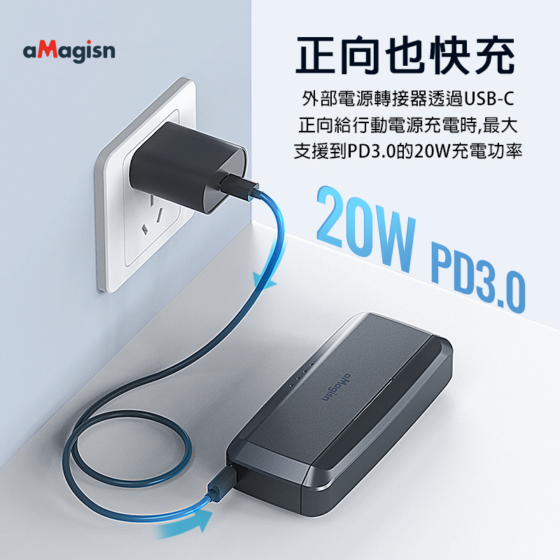 ▶透過USB-C,最大支援PD3.0的20W充電功率。