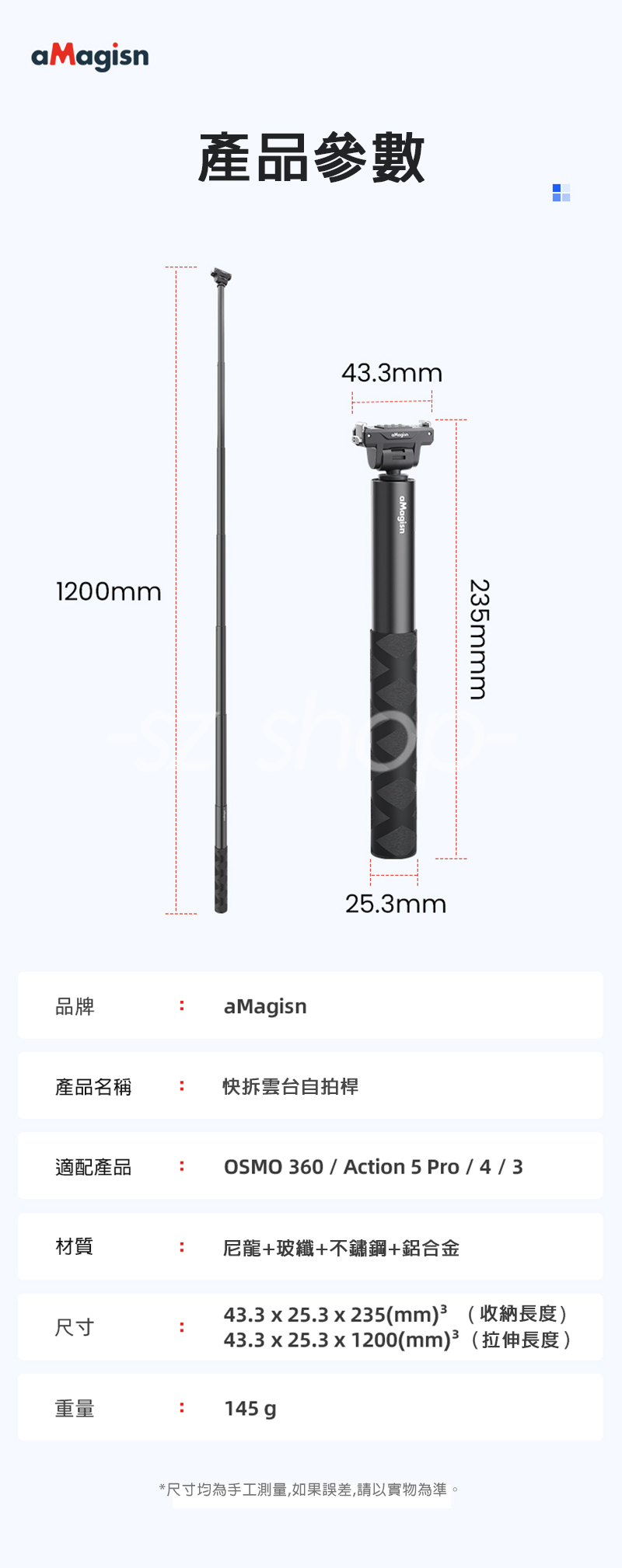 ▶品名:Action 5 Pro / 4 / 3 / OSMO 360 1.2 公尺隱形自拍桿
