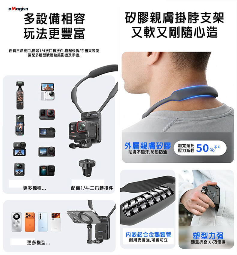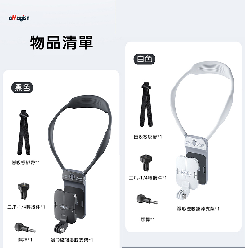 .磁吸掛脖支架x1、磁吸板綁帶x1(相機與支架間防脫落)、二爪-1/4轉接件*1、螺桿*1