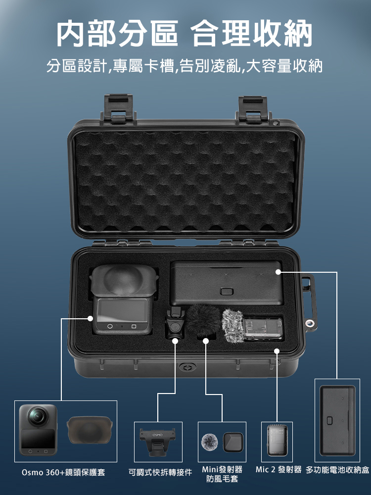 ▶可收納OSMO360主機及鏡頭保護套、快拆轉接件、Mini發射器及防風毛套、Mic 2發射器、多功能電池收納盒