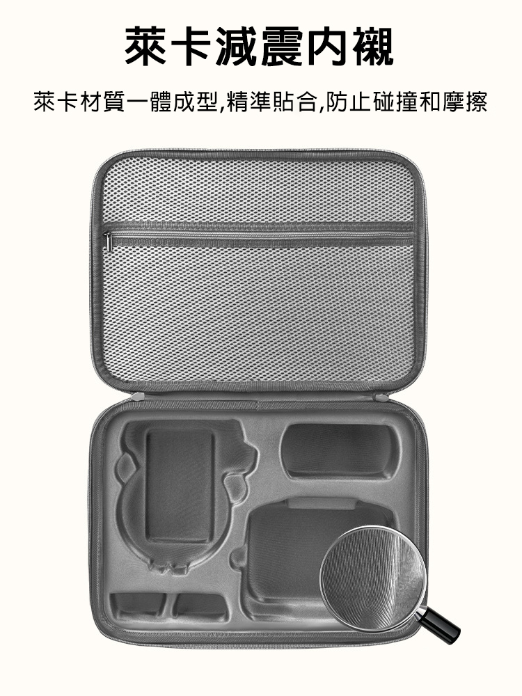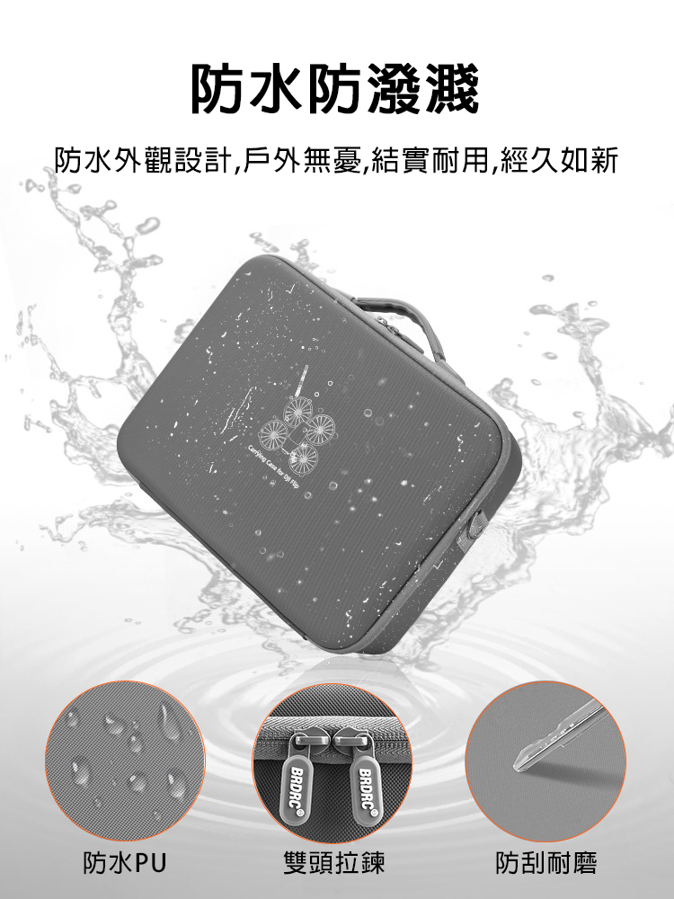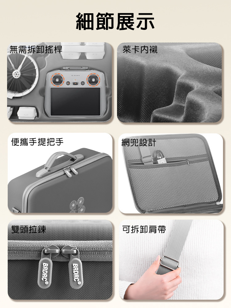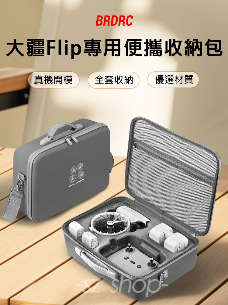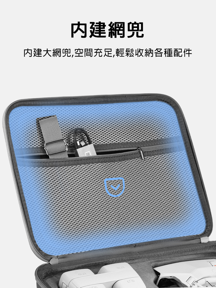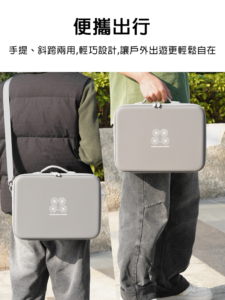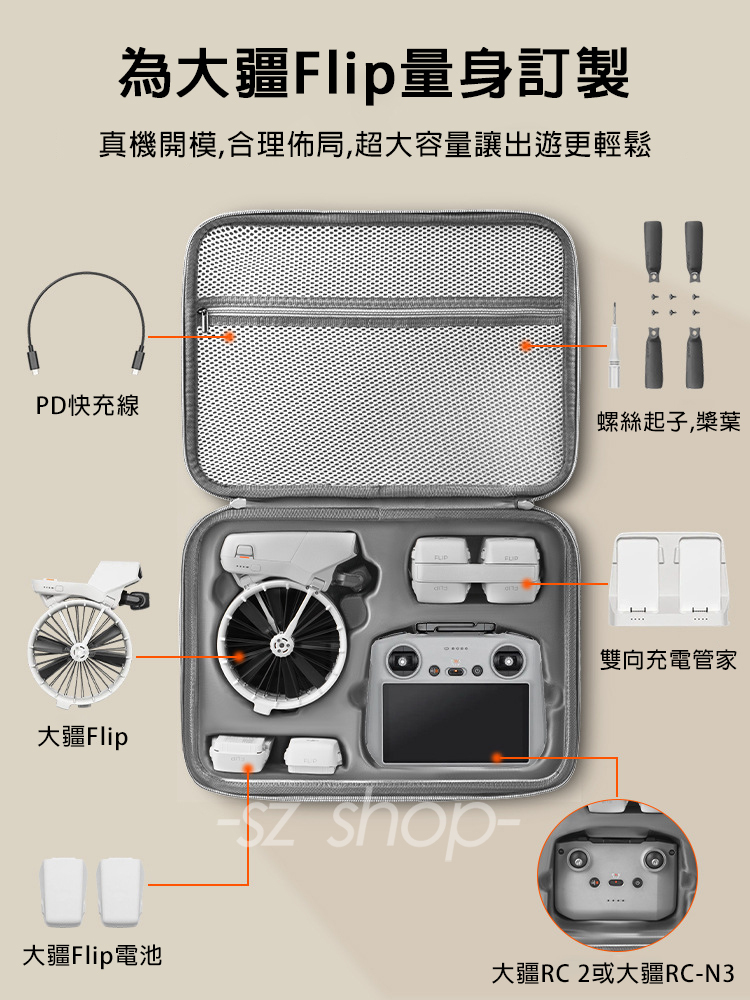.小身材大容量,可收納FLIP機身及螺旋槳、螺絲刀、充電線、遙控器(RC 2或RC N3)、電池等配件。
