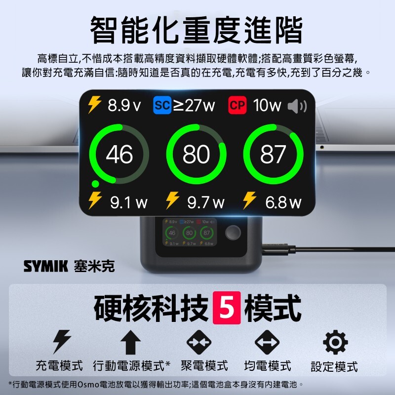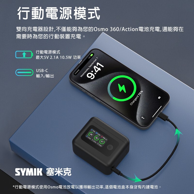 .雙向充電器設計,行動電源模式,可為行動裝置充電。