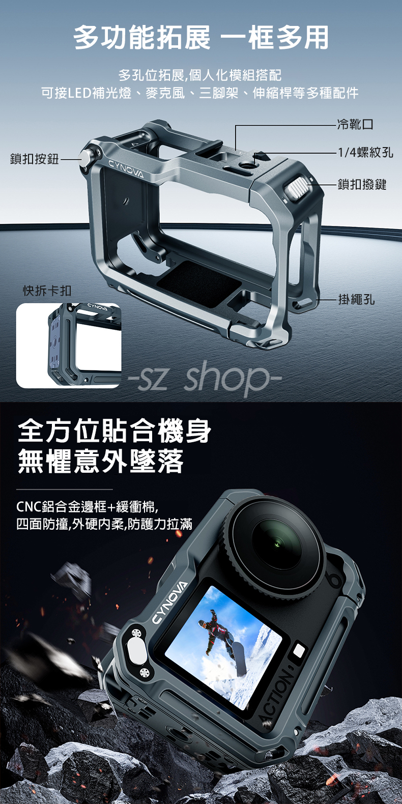 .多功能拓展,一框多用,可接補光燈、麥克風、三腳架等