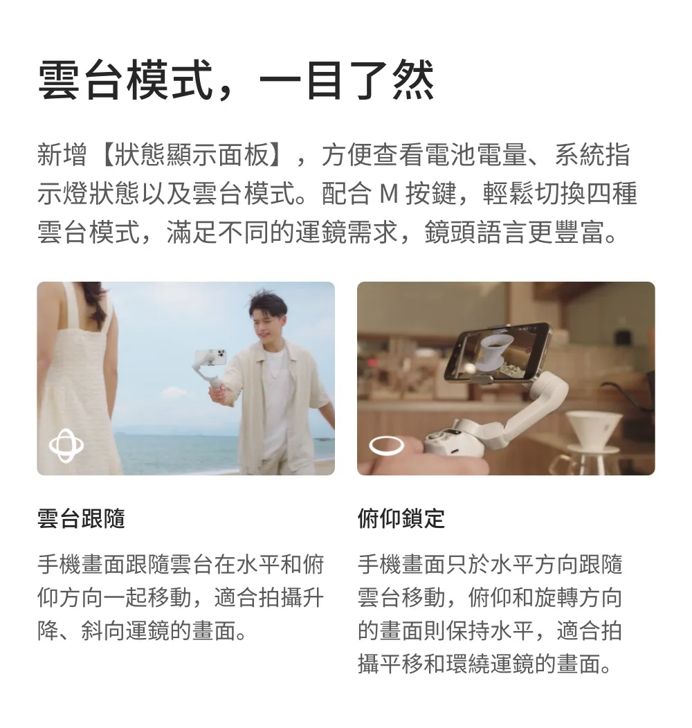 ▶新增狀態顯示面板 電量/雲台模式一目了然