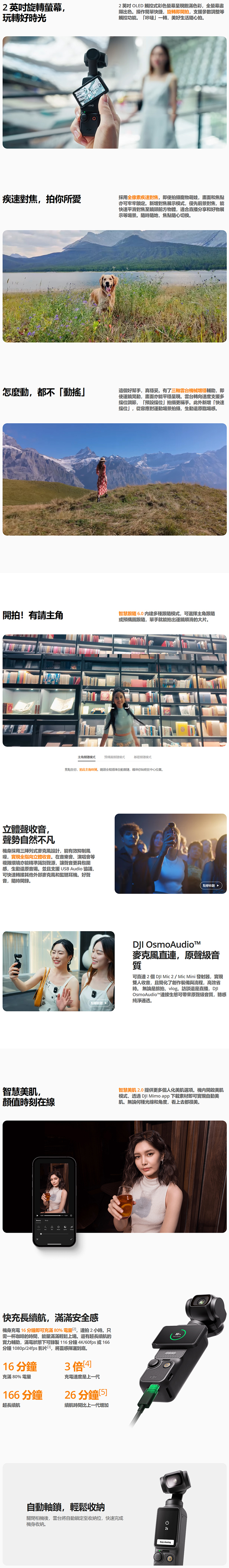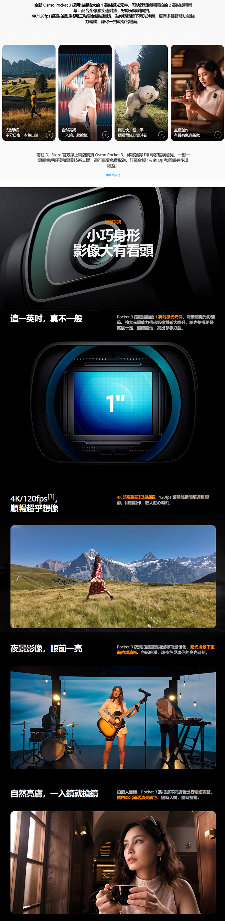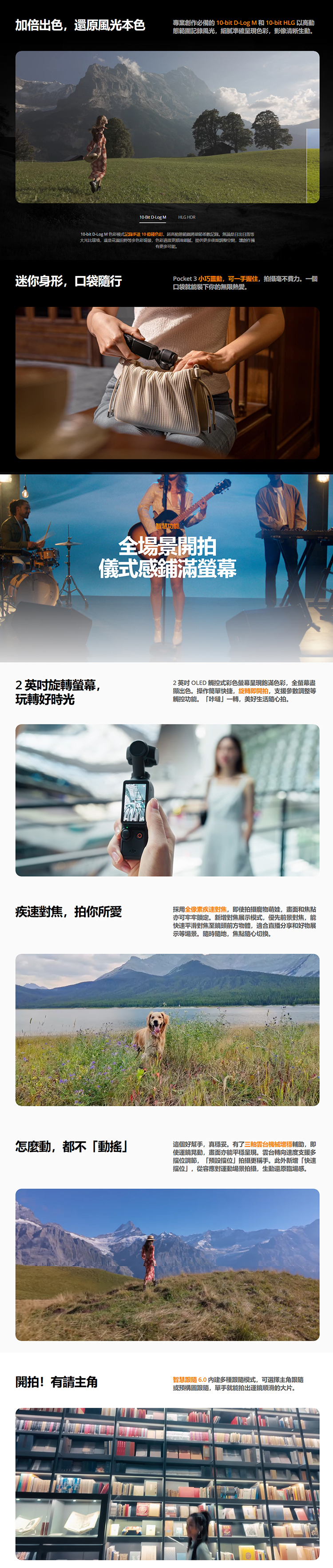 ▶全新 Osmo Pocket 3 採用性能強大的 1 英吋感光元件、可快速切換橫直拍的 2 英吋旋轉螢幕,配合全像素疾速對焦,好時光即刻開拍。
