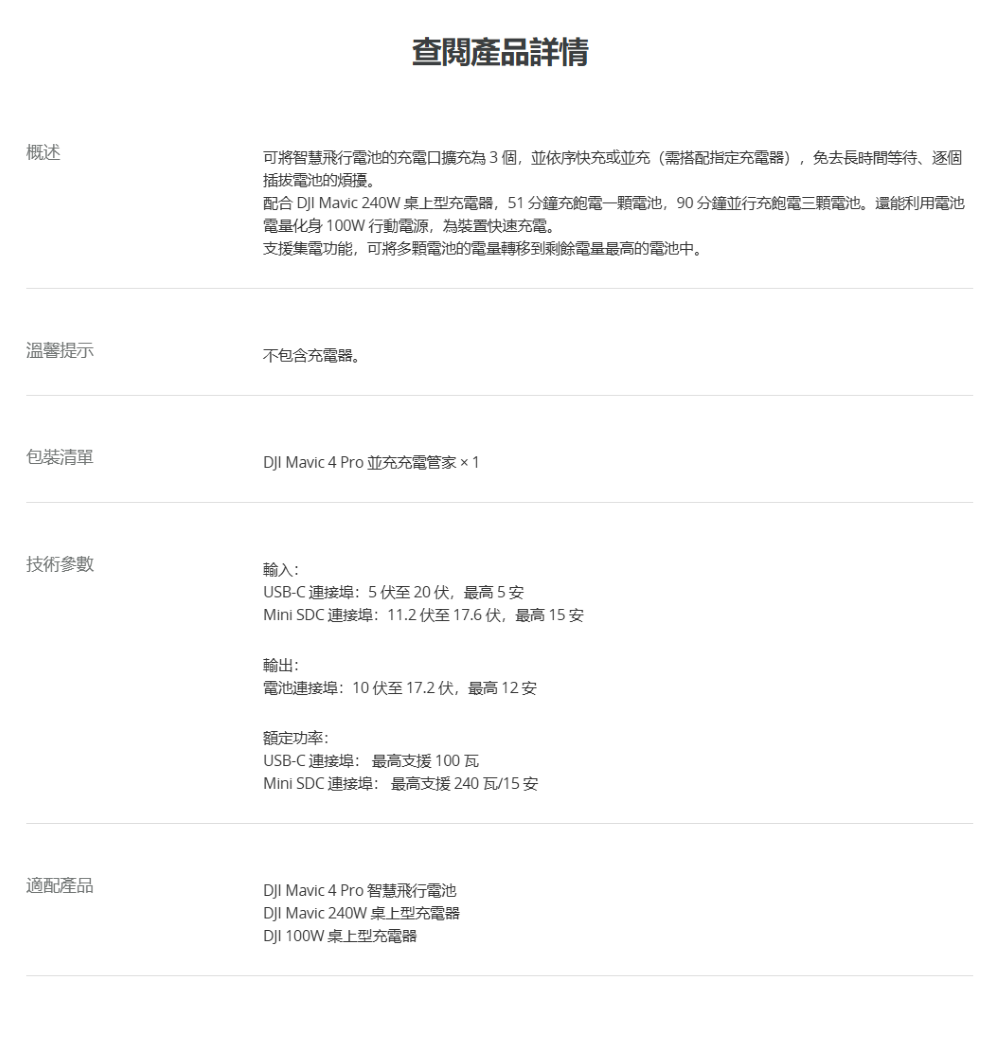 ▶可將智慧飛行電池的充電口擴充為 3 個,並依序快充或並充(需搭配指定充電器),免去長時間等待、逐個插拔電池的煩擾