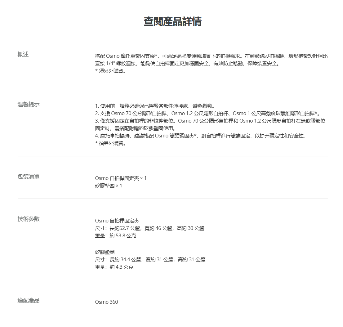 ▶搭配 Osmo 摩托車緊固支架可以滿足高強度運動拍攝,在顛簸路段拍攝時,環形抱緊設計相比直接 1/4″ 螺紋連接,自拍桿固定更加穩固安全