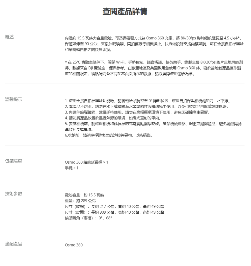 ▶內建約 15.5 瓦時電池,將 8K/30fps 影片續航延長至 4.5 小時,桿體可伸至 90 公分,支援多角度自拍與便捷相機操控