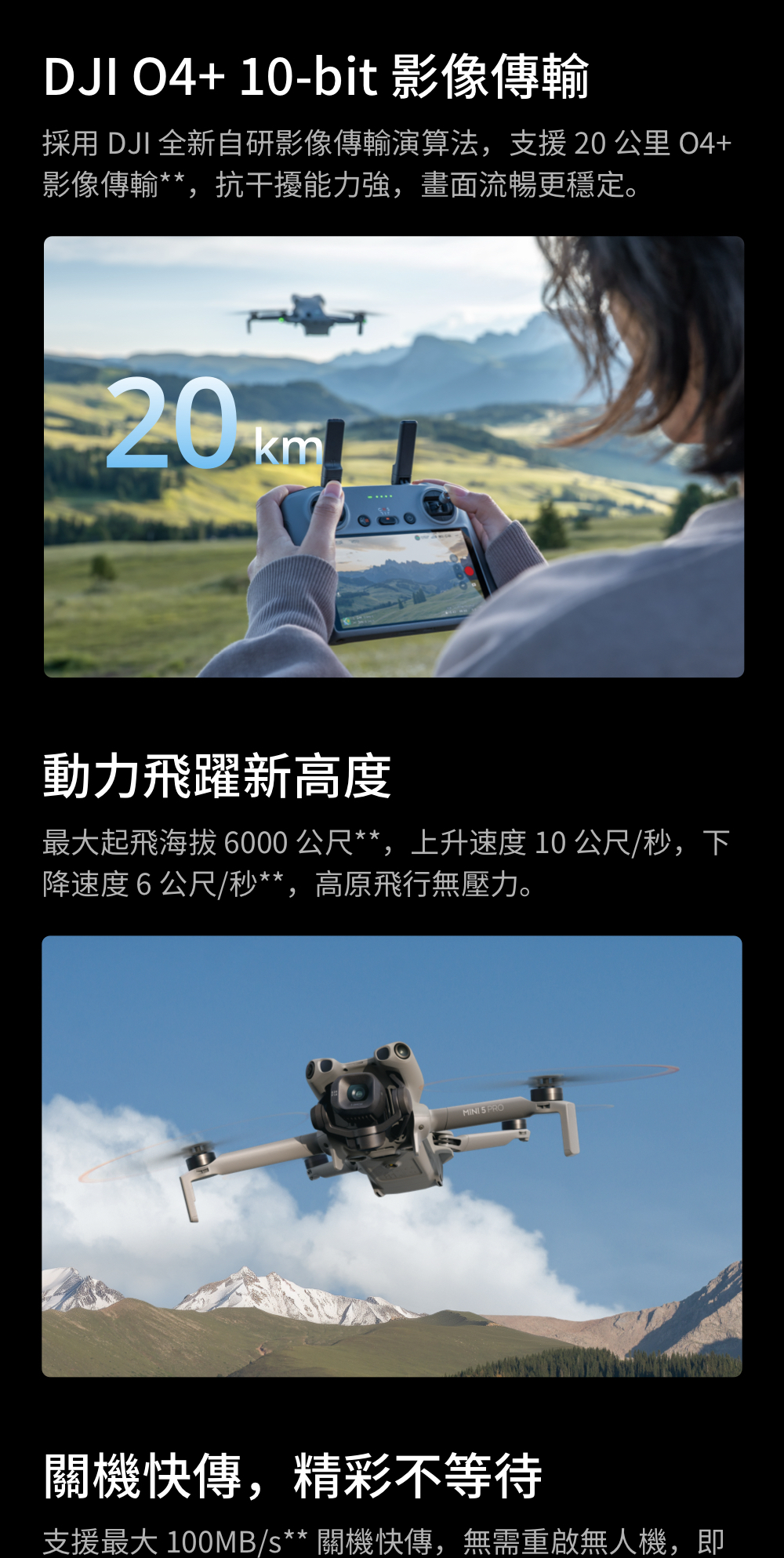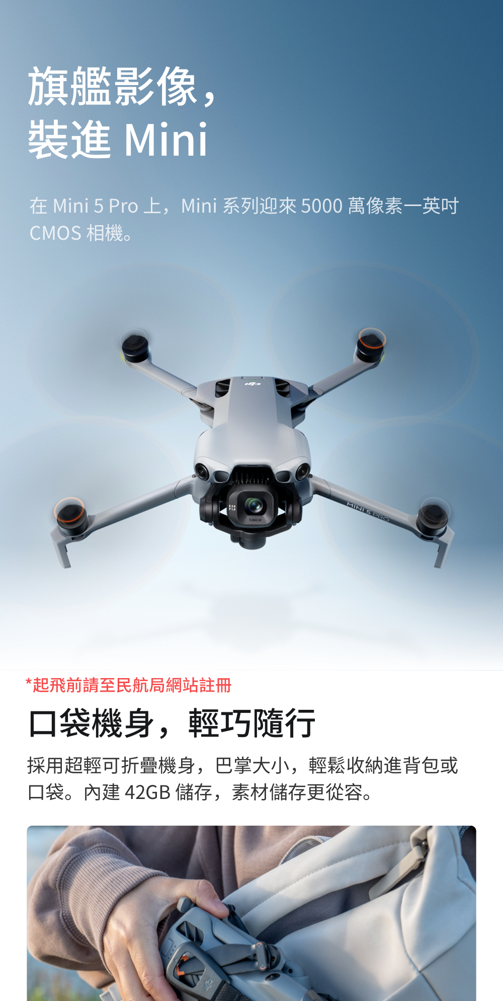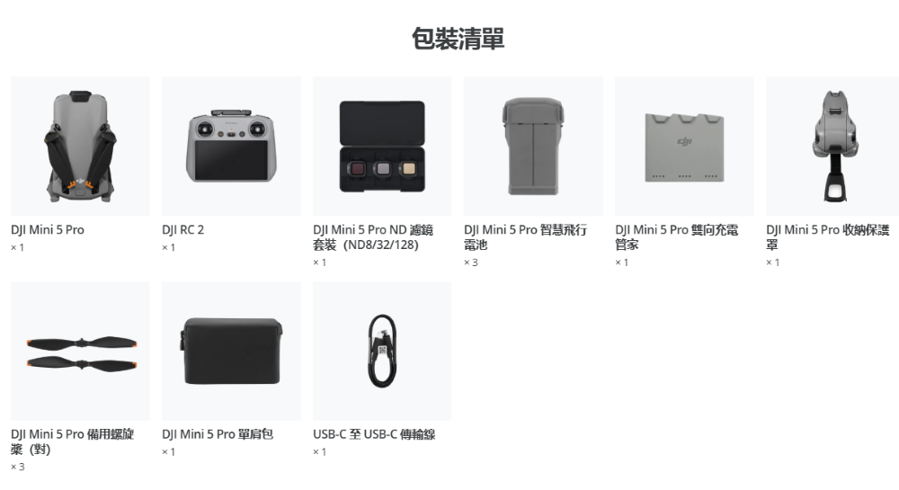 說明:產品重量可能會因物料批次不同等原因有所差異,實際重量約為 249.9 克 ± 4 克,以實物為准。最大起飛重量內含DJI Mini 5 Pro 智慧飛行電池、 microSD 卡後,請依法律規範至民航局網站註冊。在民航局上的登錄資料為最大起飛重量大於250g,必需要註冊。