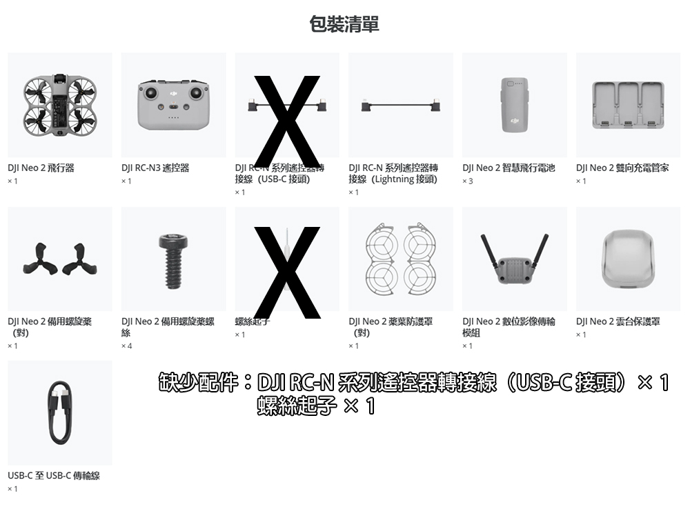 ▶缺少配件:DJI RC-N 系列遙控器轉接線(USB-C 接頭)× 1、螺絲起子 × 1