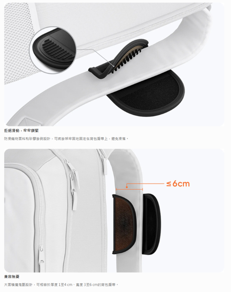 ▶相容於各種尺寸的背包帶,並配有防滑矽膠墊