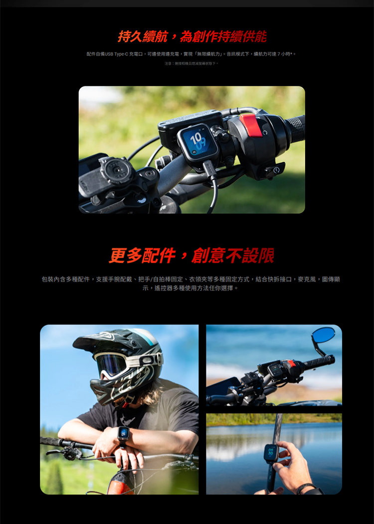.多元安裝方式,配件可固定於手腕、車把、自拍棒或衣領。