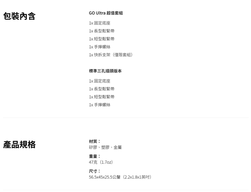 .包含底座、兩條鬆緊帶與一個拇指螺絲。