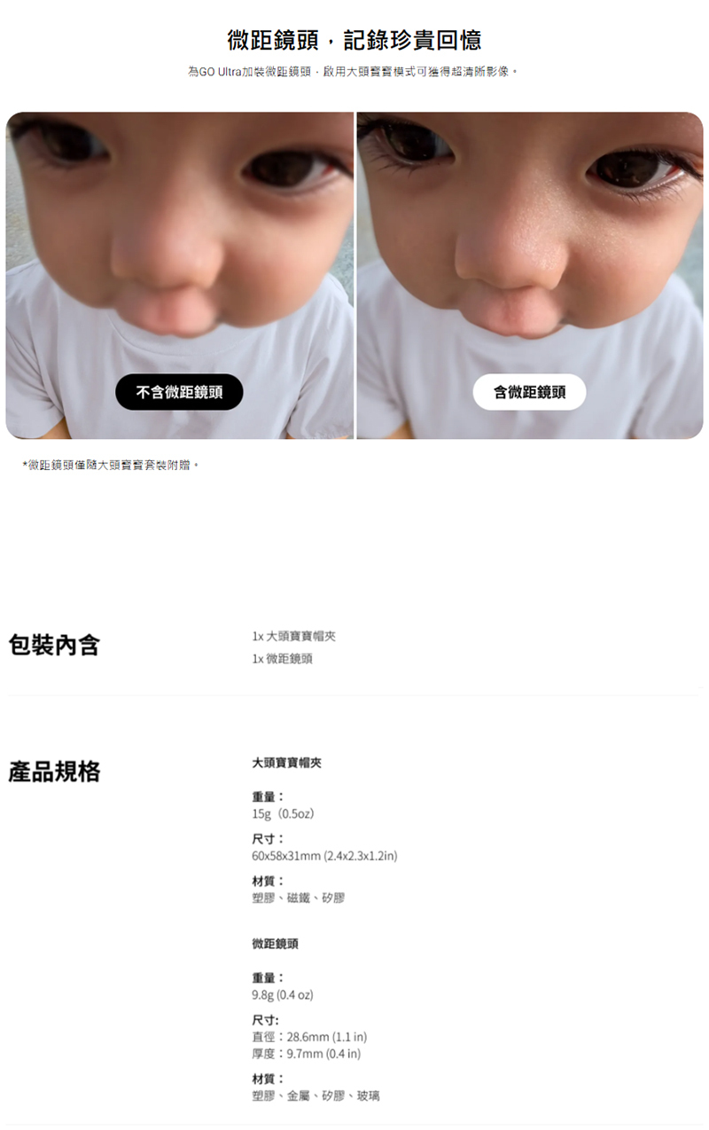▶包含 大頭寶寶帽夾 x1 與 微距鏡頭 x1。 搭配微距鏡頭時,GO Ultra 可拍攝超清晰近距離影像