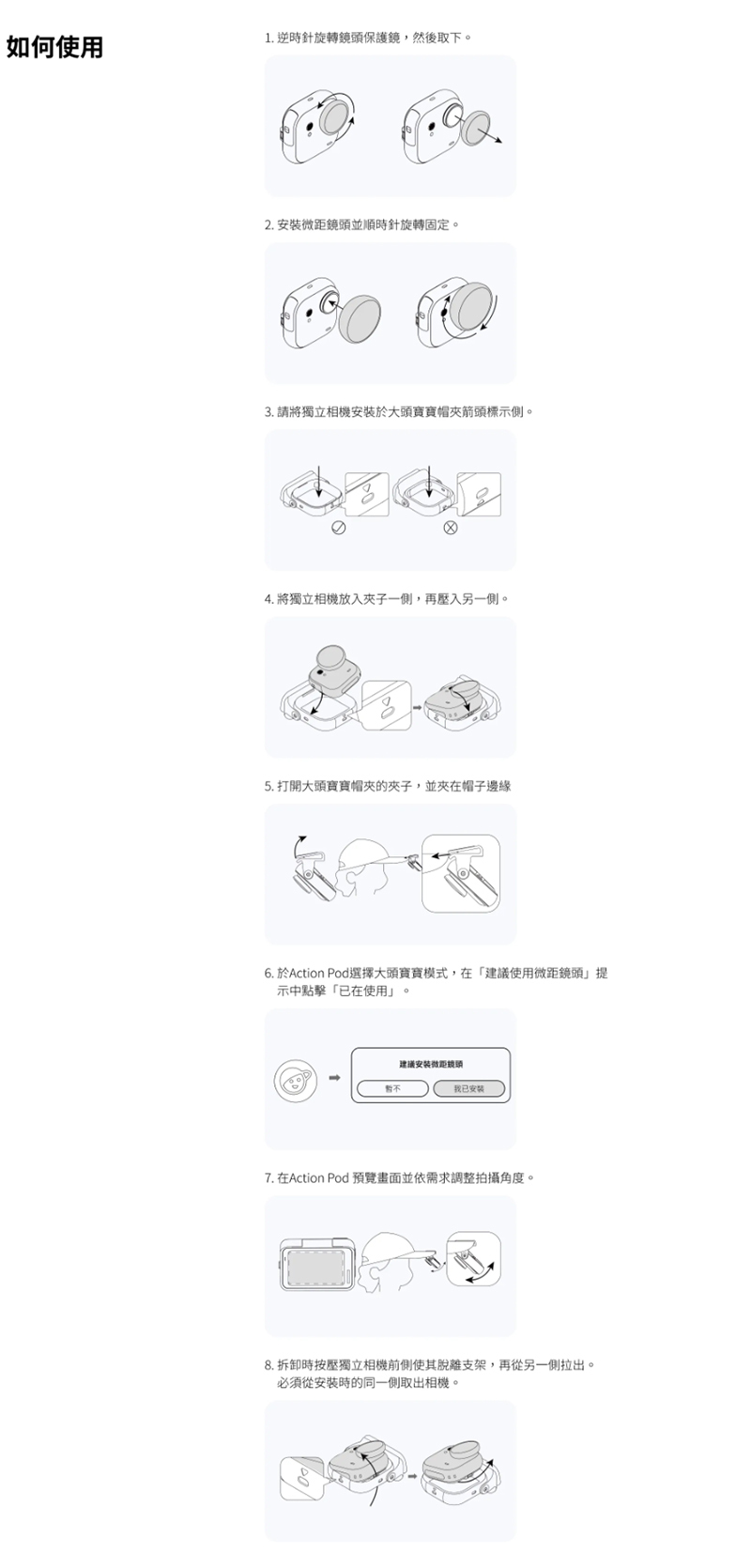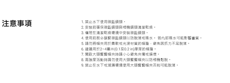 .包含 大頭寶寶帽夾 x1 與 微距鏡頭 x1。 搭配微距鏡頭時,GO Ultra 可拍攝超清晰近距離影像。