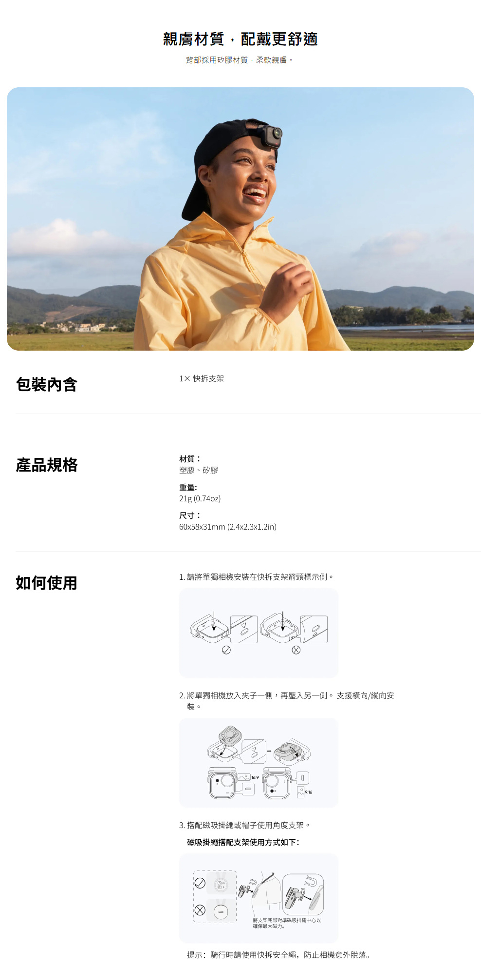 .內建可被吸附材料,搭配磁吸掛繩使用,可實現更靈活的視角調節。
