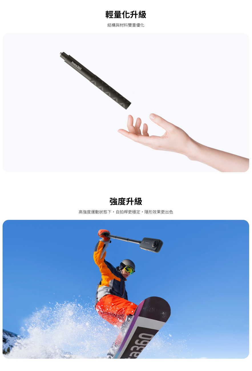 ▶全新輕量化設計,適合捕捉日常生活,但不適合高速冒險。 對於高強度運動和動作,我們推薦 運動隱形自拍棒。