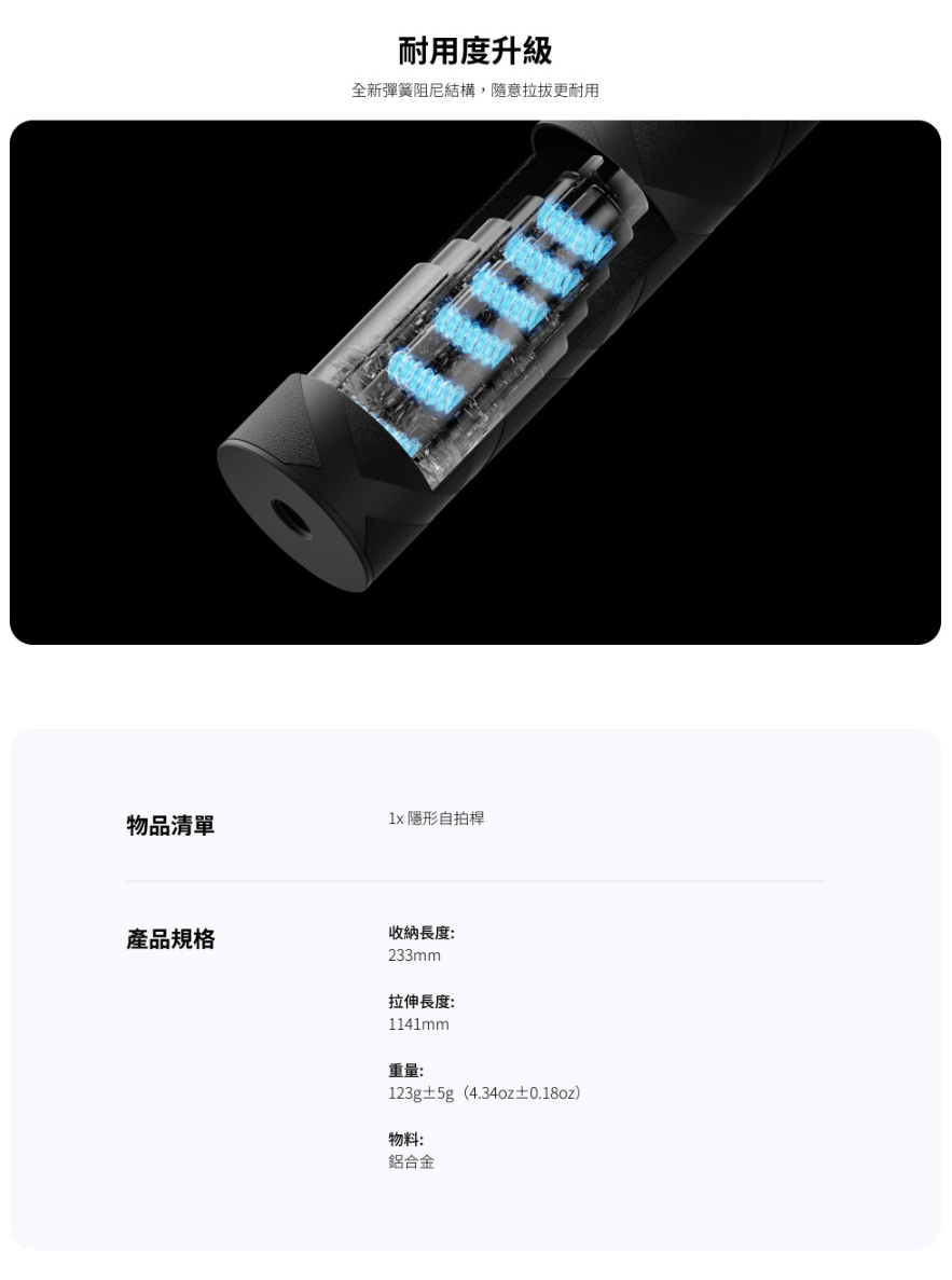 .全新輕量化設計,適合捕捉日常生活,但不適合高速冒險。 對於高強度運動和動作,我們推薦 運動隱形自拍棒。