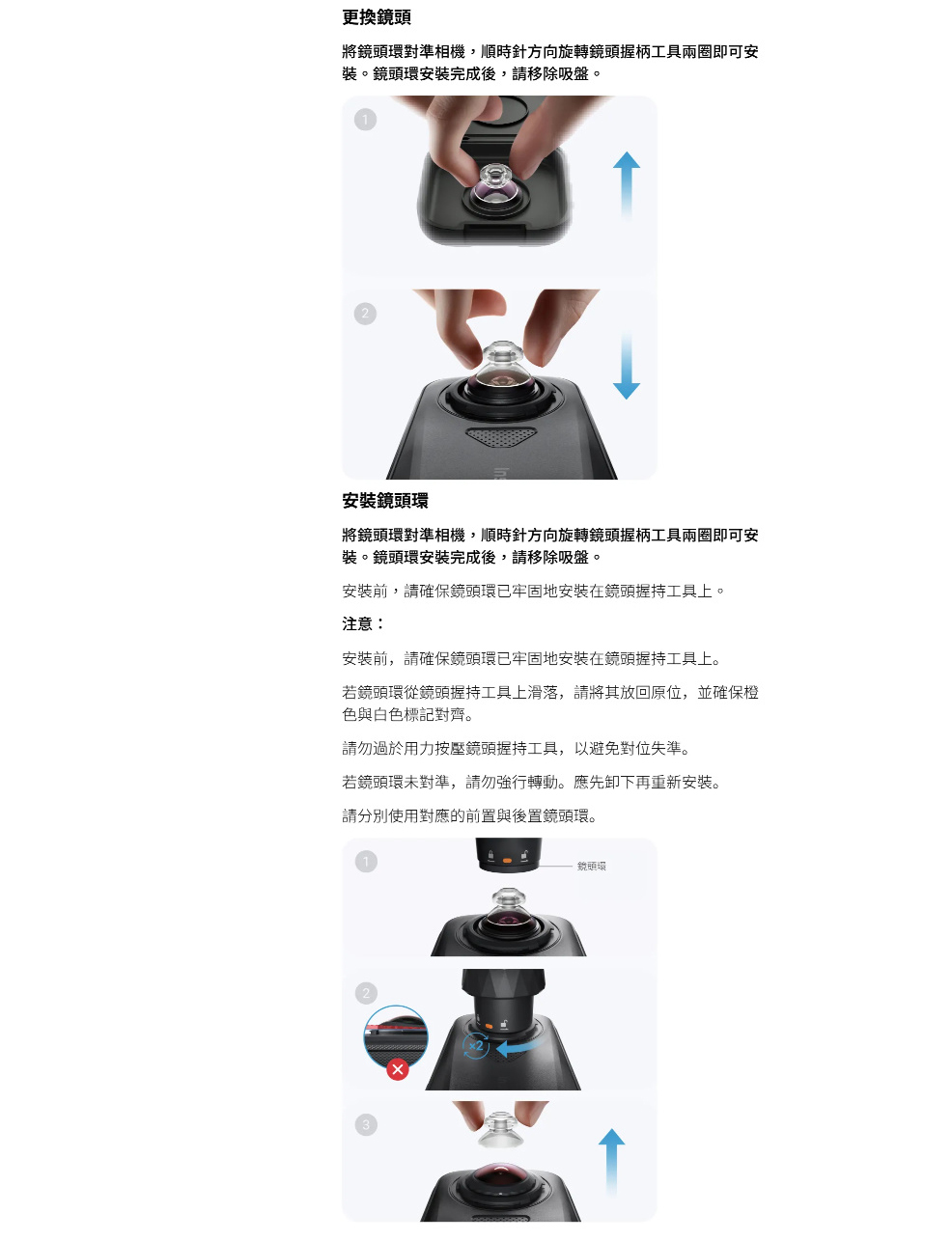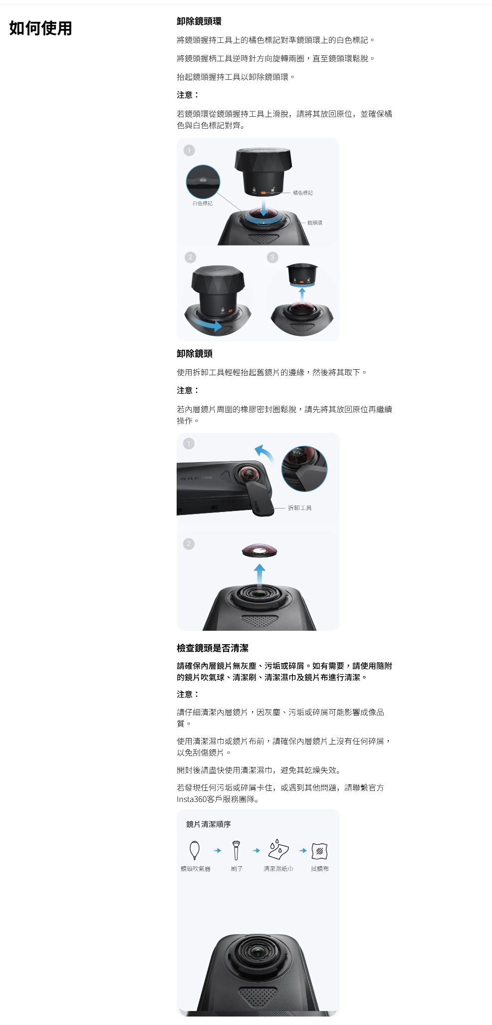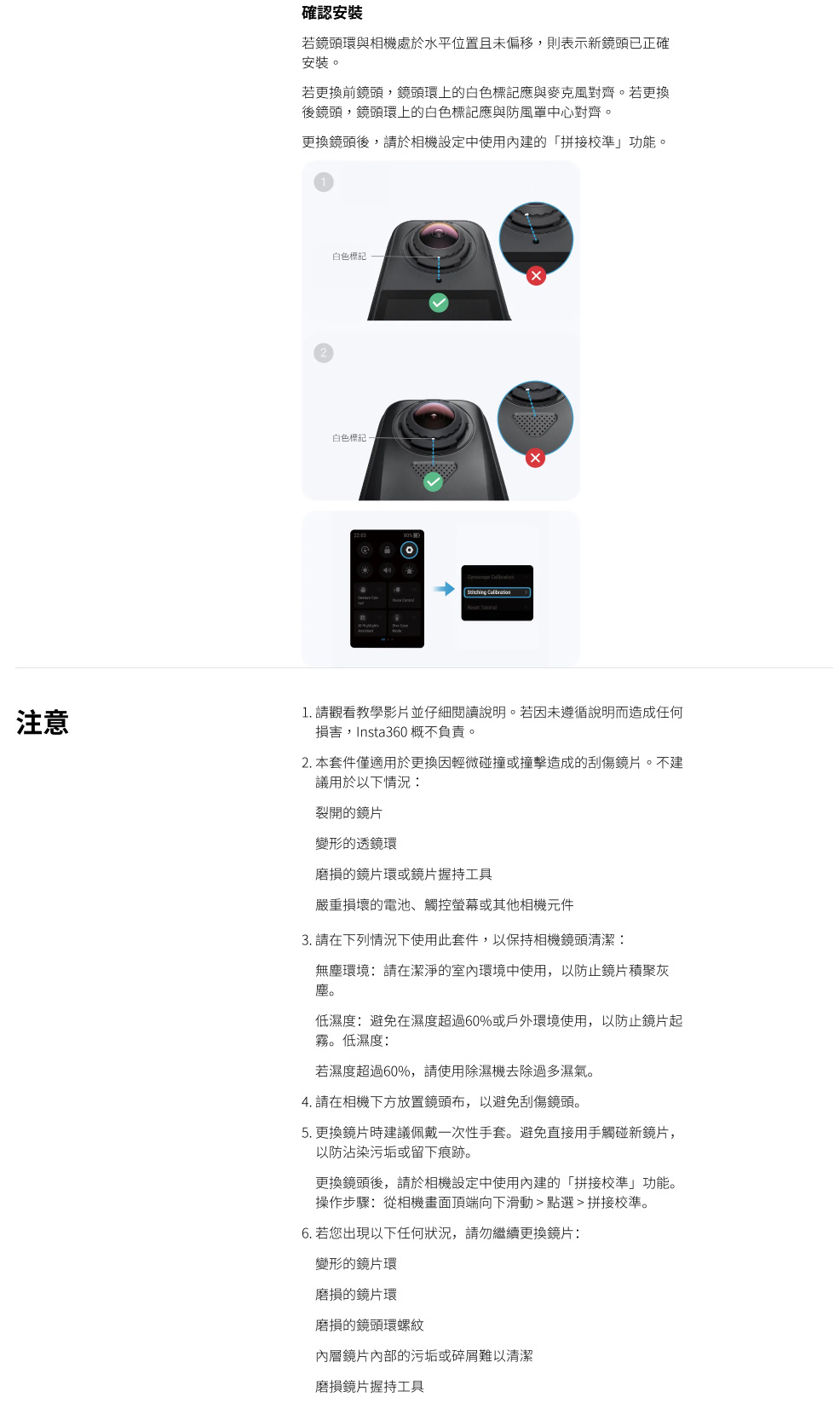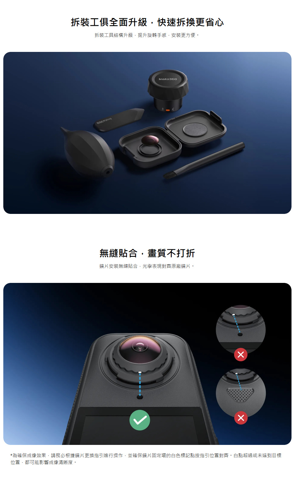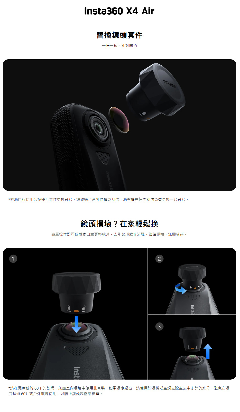 .請在清潔、無塵且濕度低於60%的室內環境中使用此配件。如需更換鏡頭保護鏡的逐步指南,請參閱Insta360教學影片。
