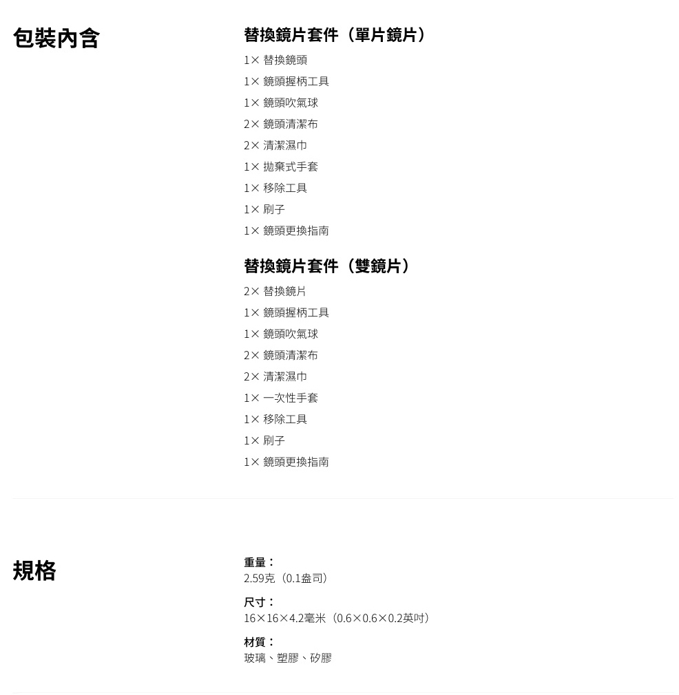 .包含您在家中更換與清潔鏡頭所需的所有工具。