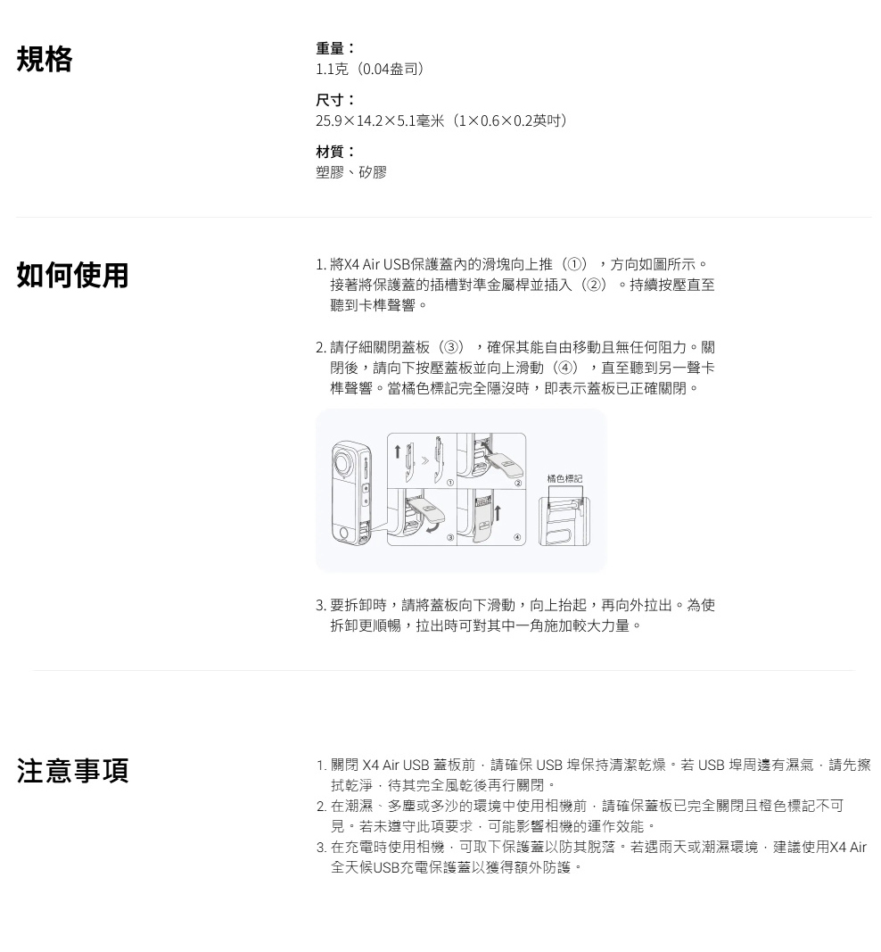 .保護相機的USB連接埠免受灰塵與濕氣侵擾。