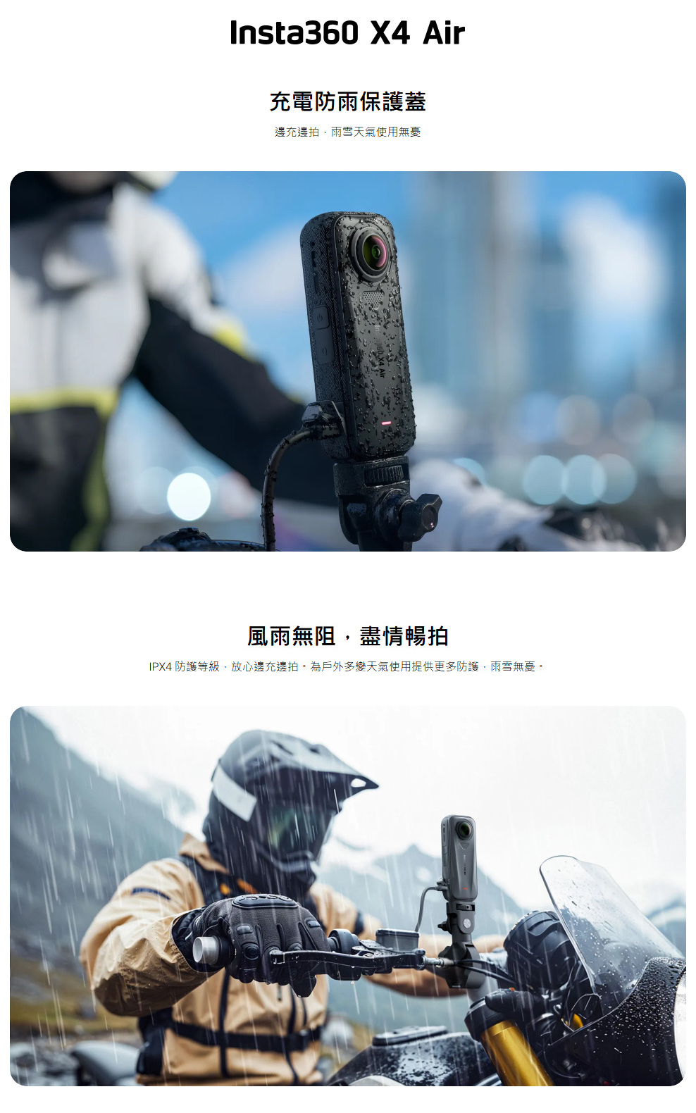 ▶IPX4 防護等級讓你能在潮濕環境下一邊拍攝一邊充電