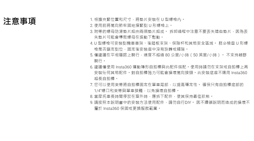 .Insta360 不提供法律建議。 機車騎士應諮詢專業人士以獲取道路使用和交通法規指導。 使用 Insta360 產品時請務必遵守當地法規。 Insta360 對於因不當使用其產品而可能產生的任何法律問題不承擔任何責任。