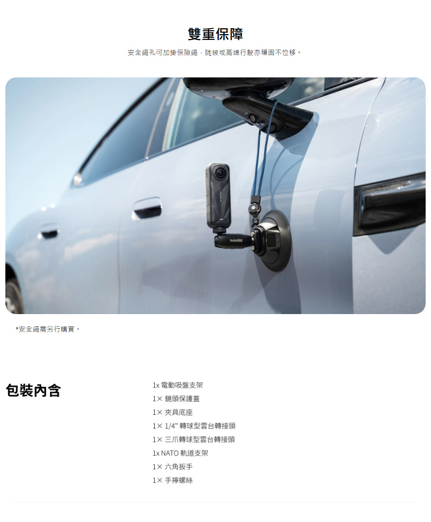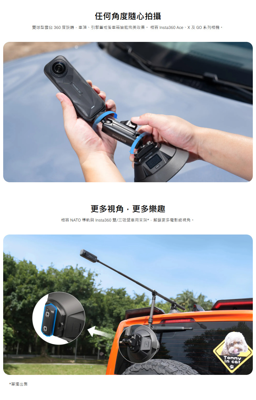 ▶相容 NATO 導軌與 Insta360 雙/三吸盤車用支架,解鎖更多電影級視角