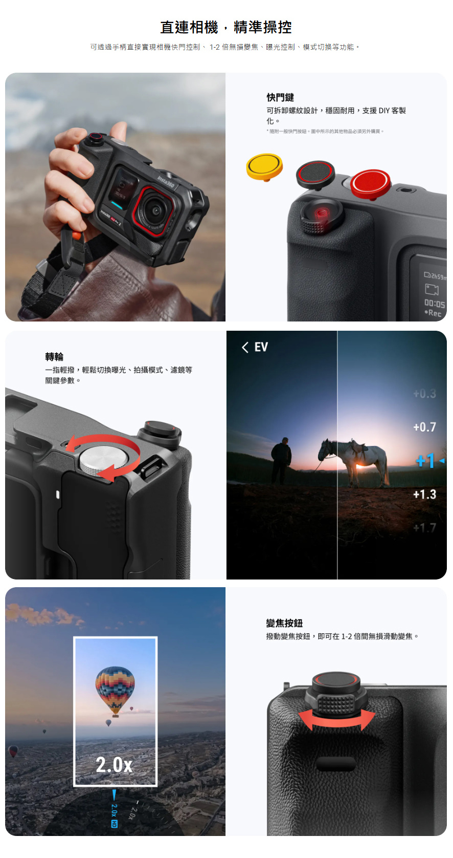 .可直接與相機連接,透過手柄進行無損變焦、曝光控制、簡易模式切換等操作。