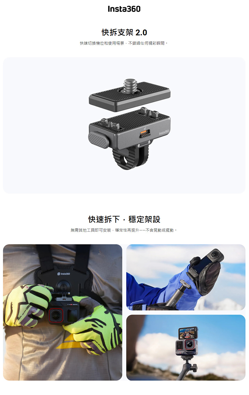 .避免在公路或越野騎行等高強度活動中使用快拆支架 2.0,因為強烈的震動和衝擊可能會導致支架故障並損壞相機。