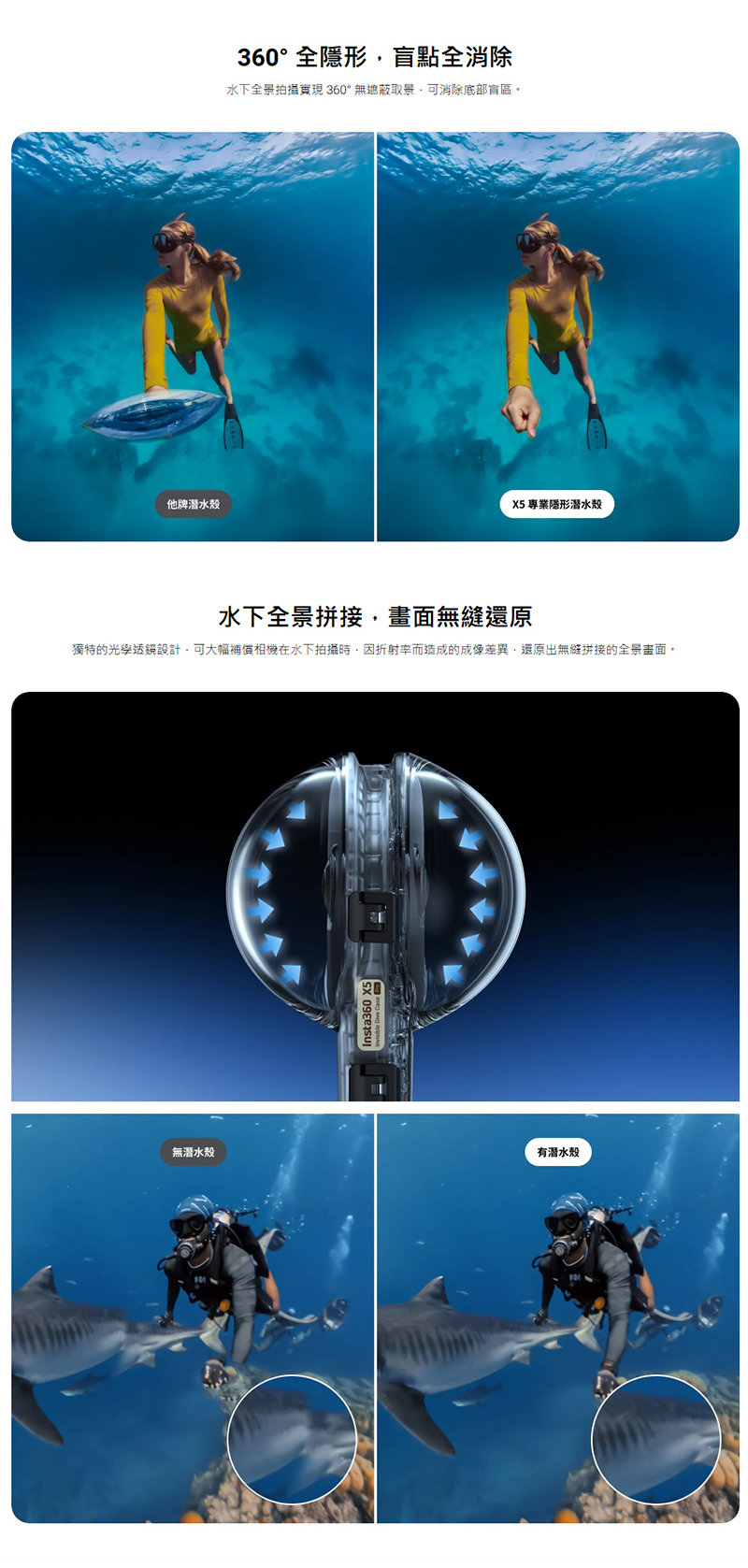 ▶完全隱形的設計可做到無縫360度水下拍攝