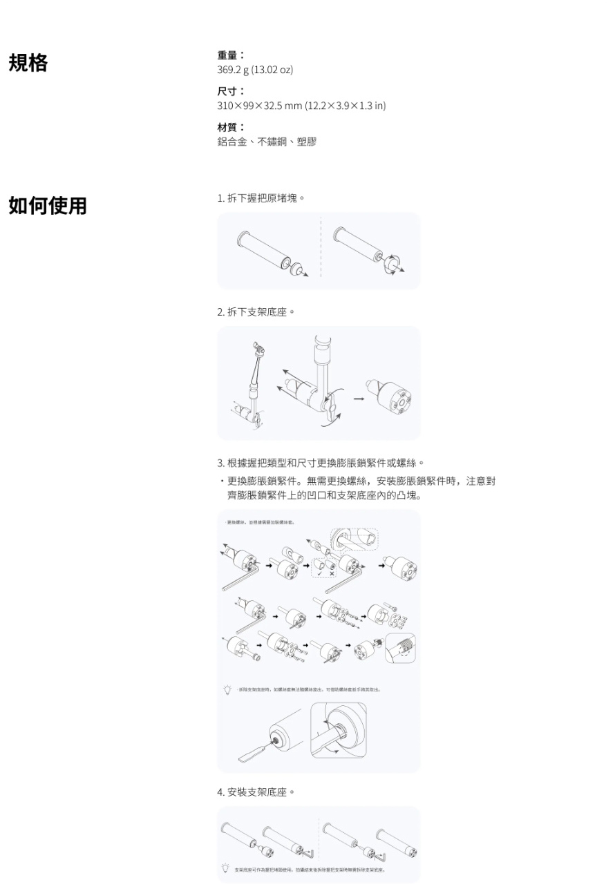 ▶安裝方式緊固,可靠性強,需注意僅可以安裝在可拆卸堵頭的空心內筒握把(內徑13mm~19mm)及帶螺紋孔握把(螺紋孔徑Ø8mm、Ø10mm或Ø12mm)。