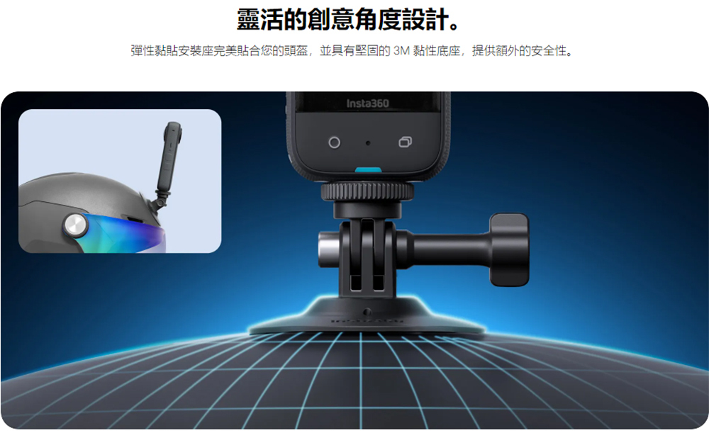 ▶新型彈性黏貼支架緊密貼合在頭盔表面