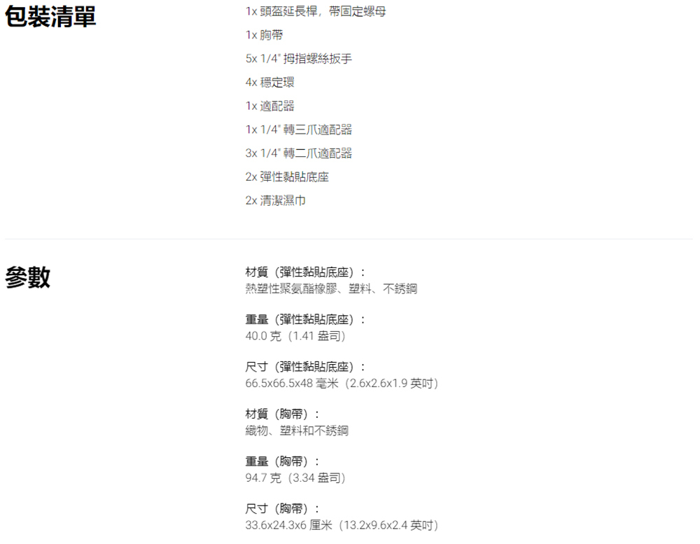 ▶包括胸帶、頭盔延長桿、彈性黏貼支架和安裝部件