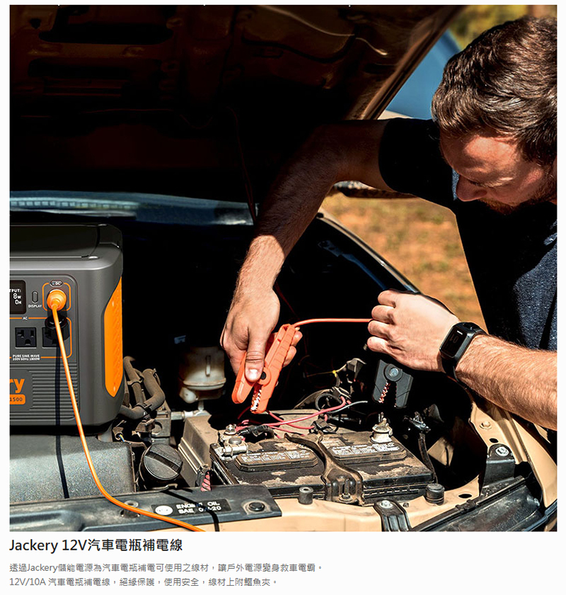 .透過Jackery儲能電源為汽車電瓶補電使用之線材。