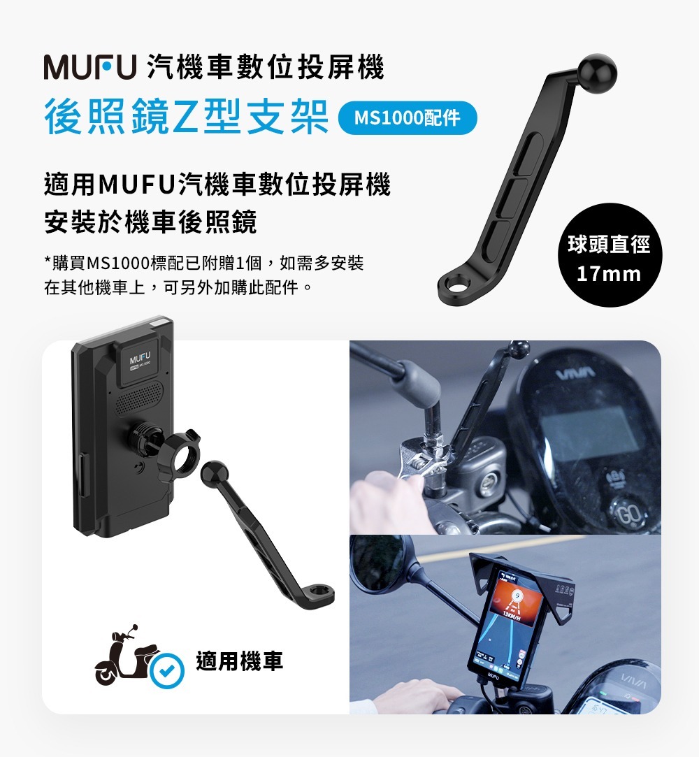 ▶後照鏡Z型支架適用MUFU汽機車數位投屏機MS1000,可自行安裝於機車後照鏡。