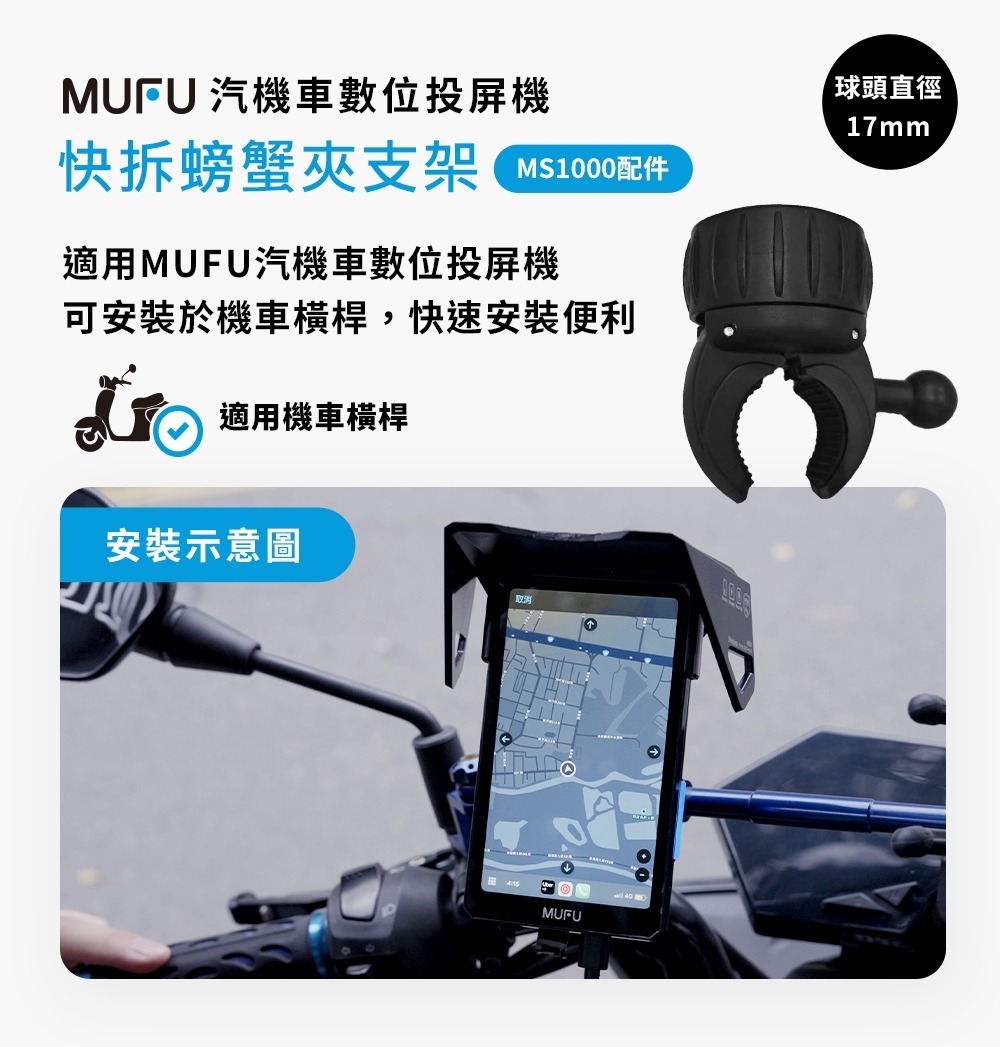 快拆螃蟹夾支架適用MUFU汽機車數位投屏機MS1000,可安裝於機車橫桿,快速安裝便利。
