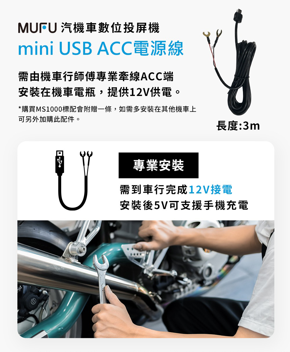mini USB ACC電源線適用MUFU汽機車數位投屏機MS1000,需由機車行師傅專業牽線ACC端安裝在機車電瓶,提供12V供電。