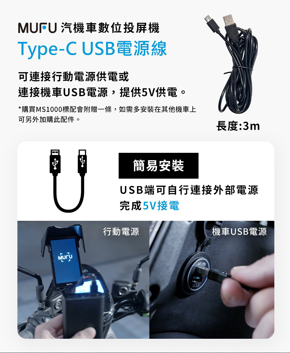 ▶Type-C USB電源線適用MUFU汽機車數位投屏機MS1000,可連接行動電源供電或連接機車USB電源,提供5V供電。