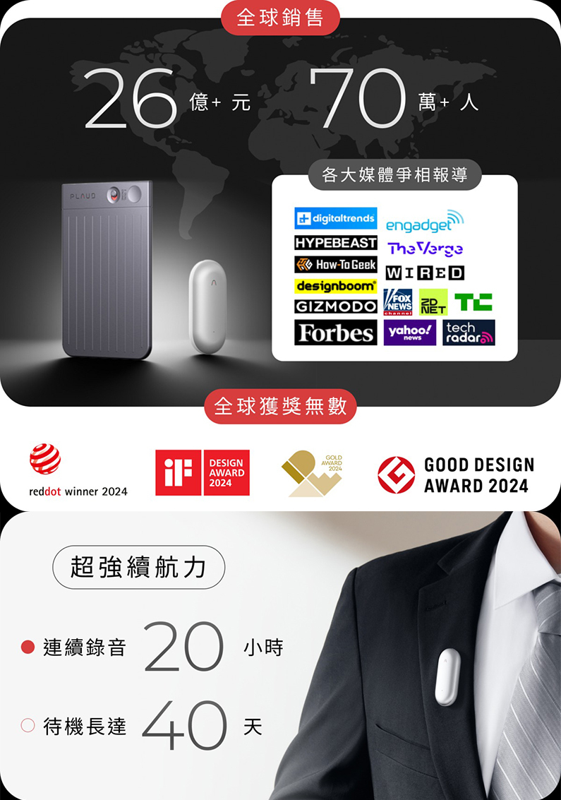 •第一代 PLAUD NOTE 首款 AI 智慧錄音卡,創下全球銷售破 26 億、超過 70 萬人購買的佳績!