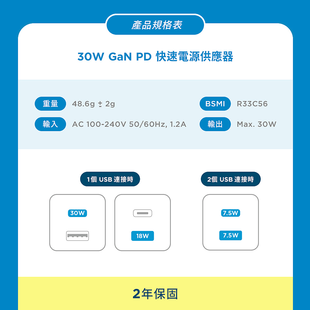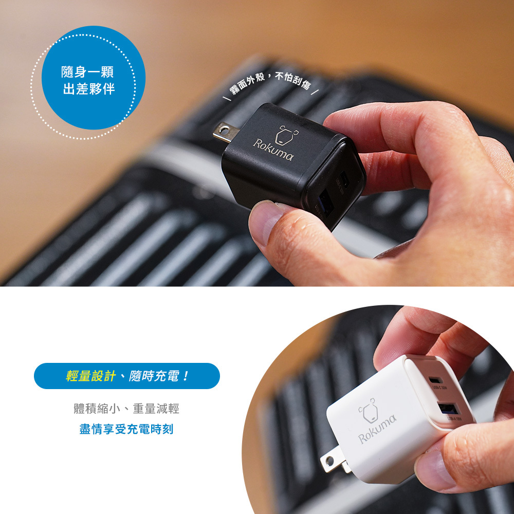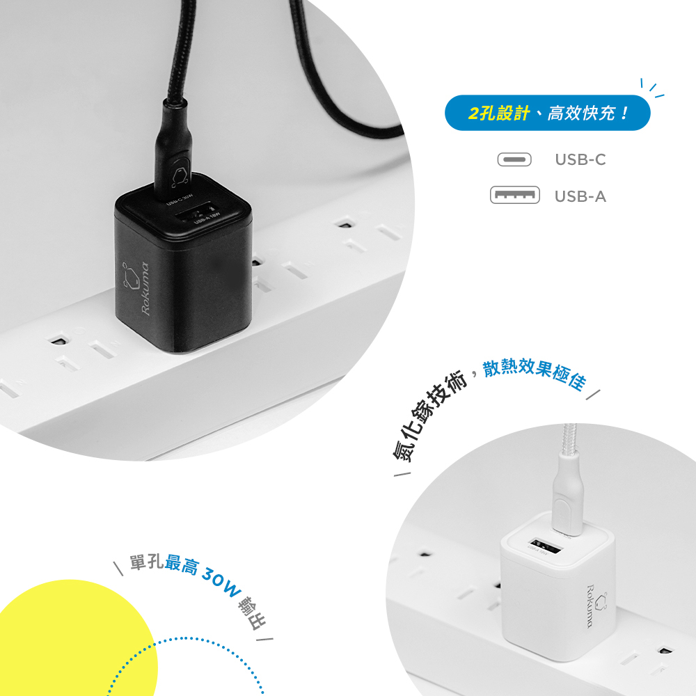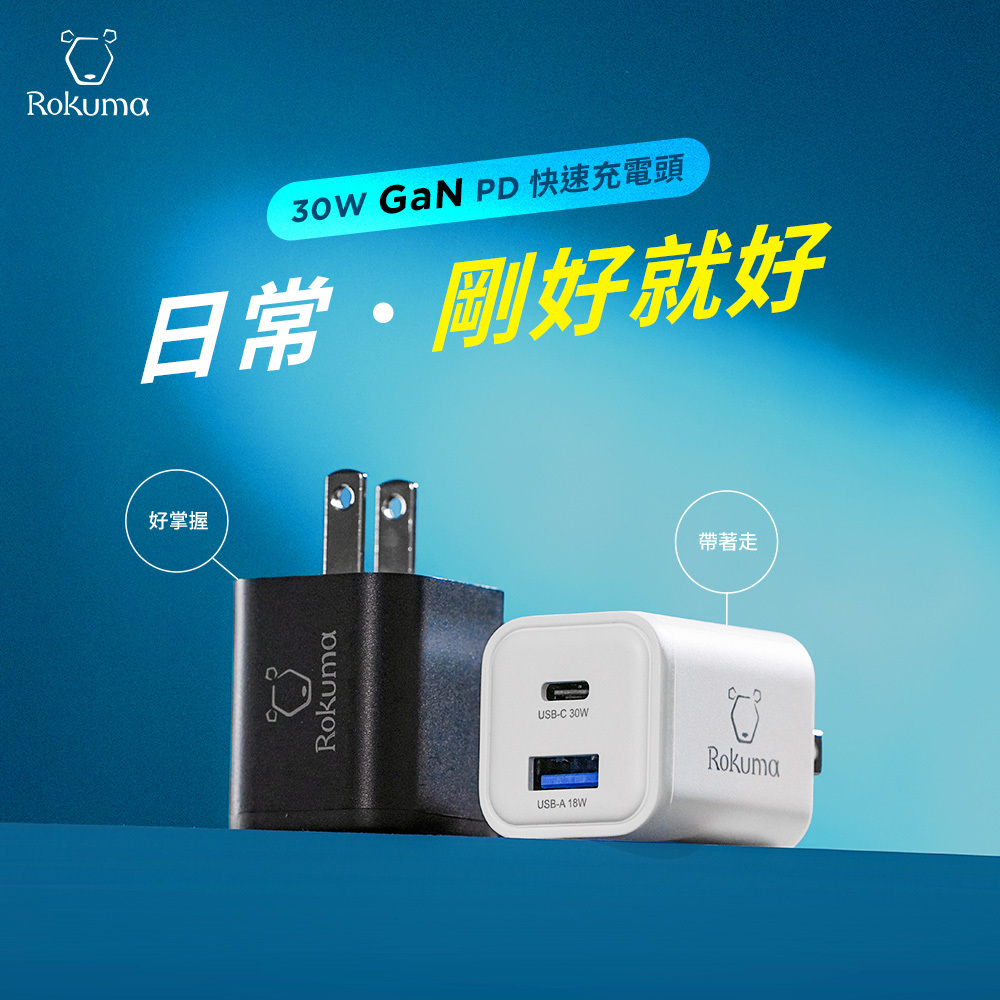 ▶品名:Rokuma 30W GaN氮化鎵 2孔 PD快充充電器 原廠公司貨