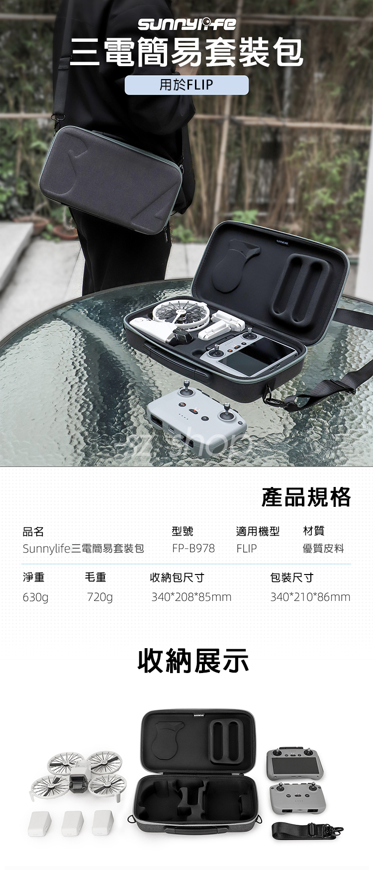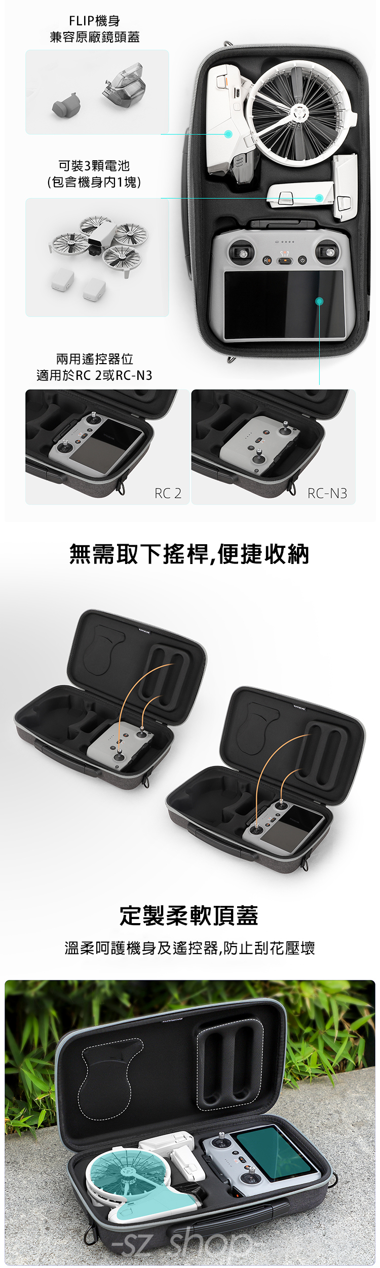 .套裝包可收納FLIP機身、兩用遙控器位(適用RC 2 或 RC N3)、3塊電池(包含機身內1塊)