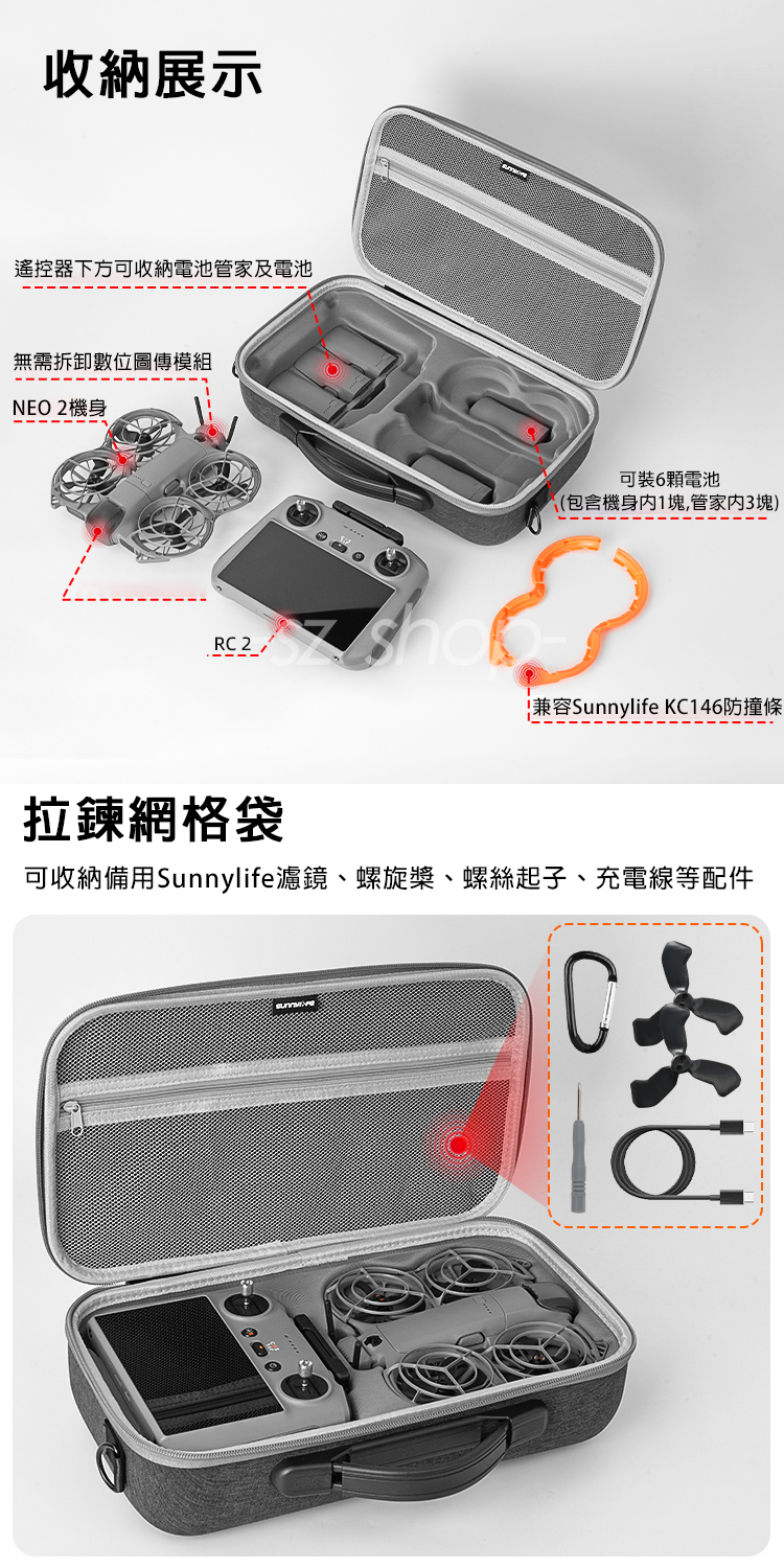 裝得下一台NEO 2空拍機(可含Sunnylife防撞圈)+數字圖傳模組+一台RC 2遙控器+充電管家+6顆電池(含機身及充電管家內)